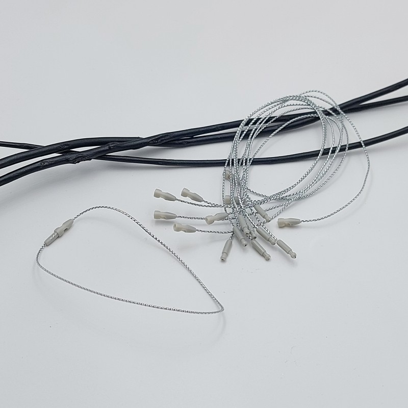Cordon en polyester métallisés avec extrémités en plastique à encliquetage souple.